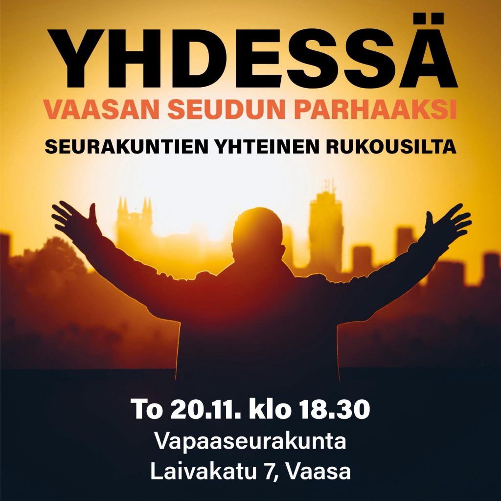 - To 20.11. klo 18.30 Yhdessä Vaasan seudun parhaaksi – seurakuntien yhteinen rukousilta (Vapiksella)